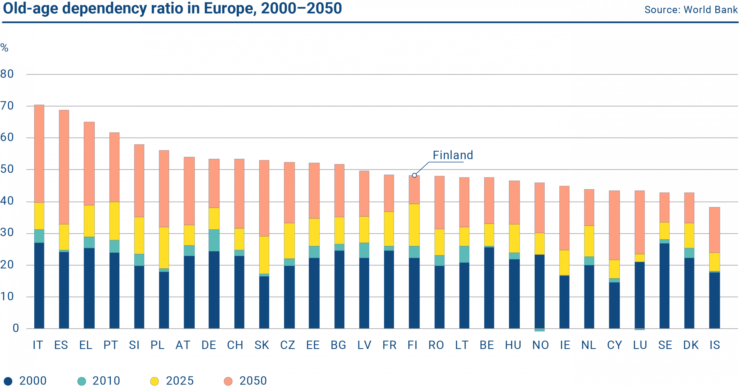 Finland’s relative position improves as demographic pressures become lighter here than in many peer countries.