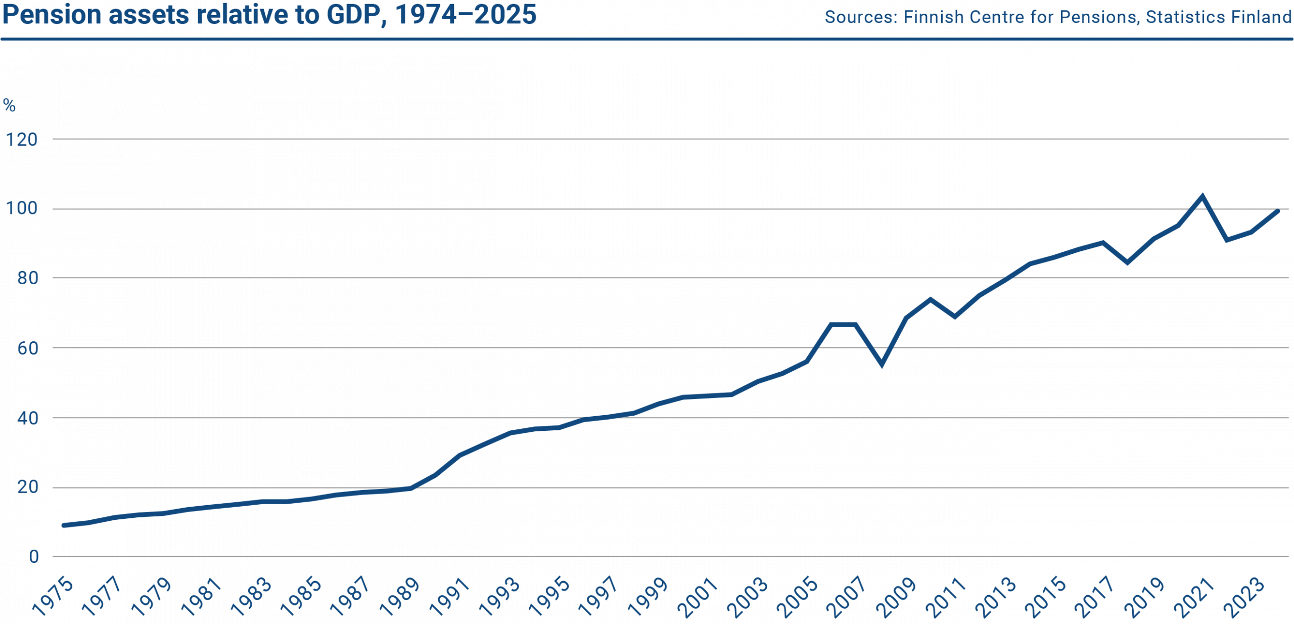 Finland’s earnings‑related pension funds have improved the efficiency of pension financing through the financial markets. Contributions have been invested with a long‑term horizon in higher‑risk assets, generating returns that have exceeded the central government’s funding costs (the nominal return of pension insurers between 1998 and 2024 averaged around 5.7%). This return differential reflects the longer investment horizon and greater risk‑bearing capacity of pension funds, and has helped spread the fiscal burden of ageing over time.