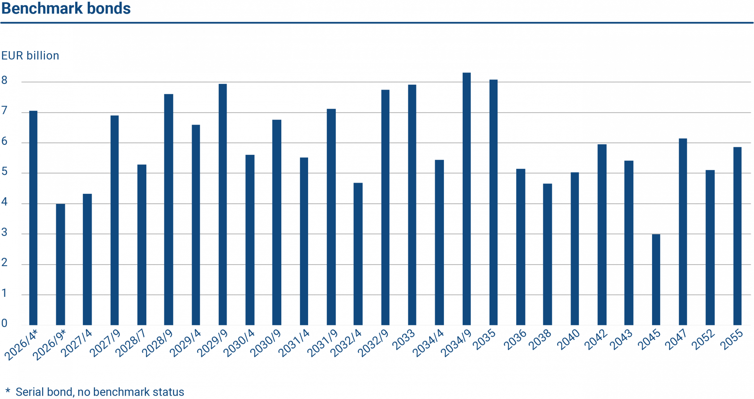 The graph shows all outstanding serial bonds issued by the State Treasury. Of these, the majority are benchmark bonds.