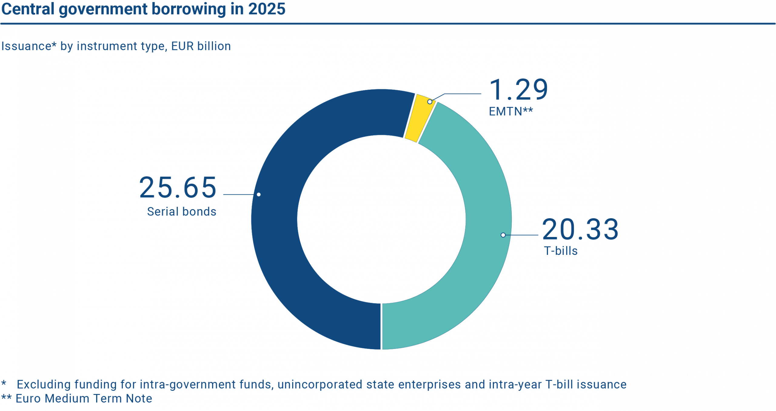 The realised gross borrowing amount in 2025 was EUR 47.26 billion. Of this amount, long-term issuance accounted for EUR 26.93 billion and short-term borrowing for EUR 20.33 billion.