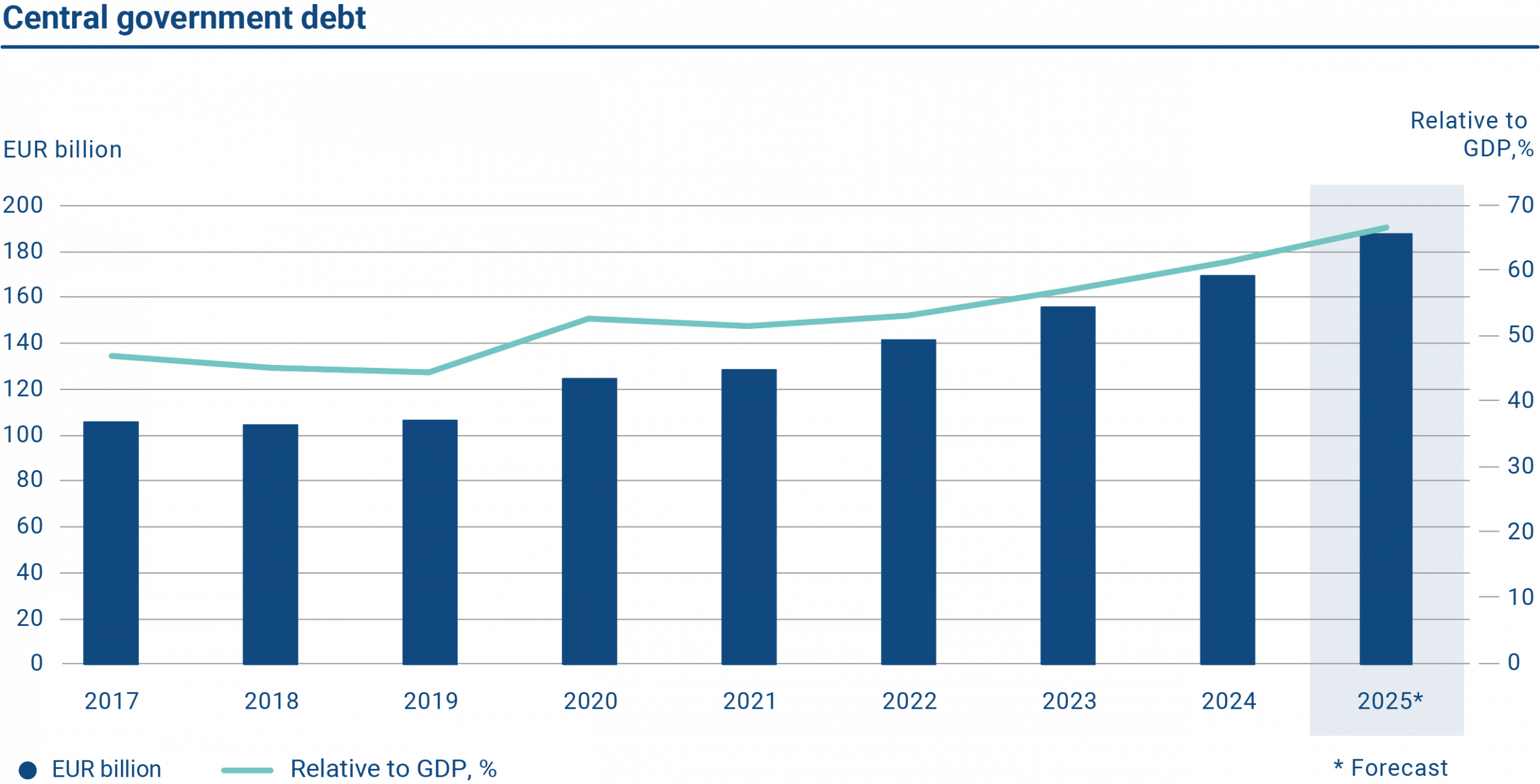 The graph shows the volume of Finland’s central government debt and debt in relation to GDP in 2017–2025. The central government debt was EUR 187.67 billion at the end of 2025. The debt-to-GDP ratio was 66.70%.