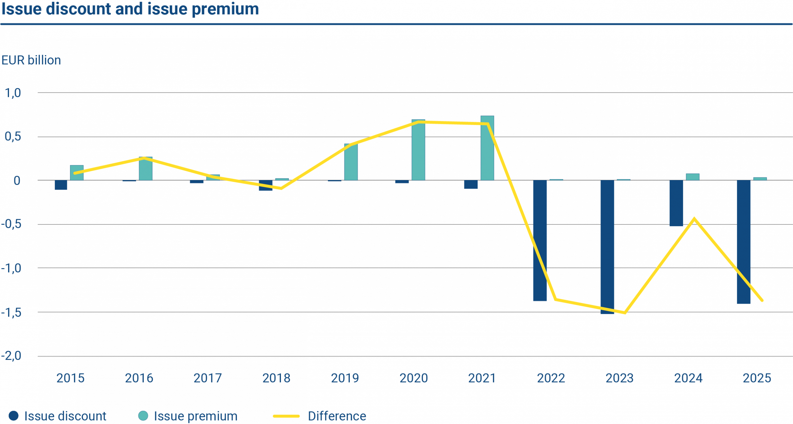 In 2025, issuing some benchmark bonds below par, i.e. the bond’s nominal value, resulted in an increase in nominal issuance and thus nominal borrowing. In accounting, bond issue premia and discounts are referred to as valuation accounts or amortizing items. These do not reflect any profit or loss of the activity but adjust the carrying value of the bond on the balance sheet.