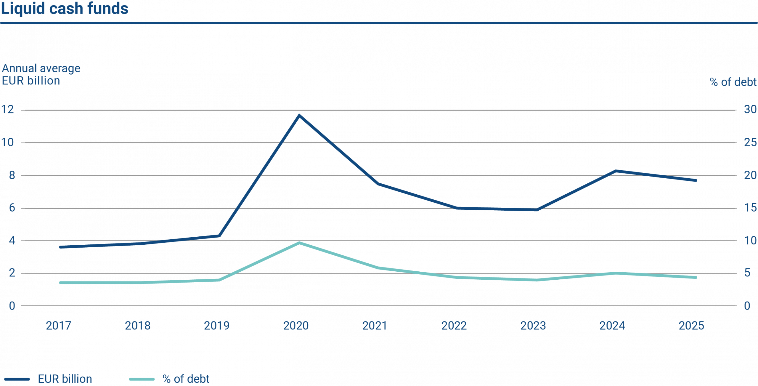 Liquidity management relies on the central government cash flow forecast system. All government accounting entities forecast their income and expenditure for the next 12-month period into the system. The State Treasury uses this data as a basis for liquidity management decisions. In 2025, the central government’s average month‑end cash balance was EUR 7.7 billion.