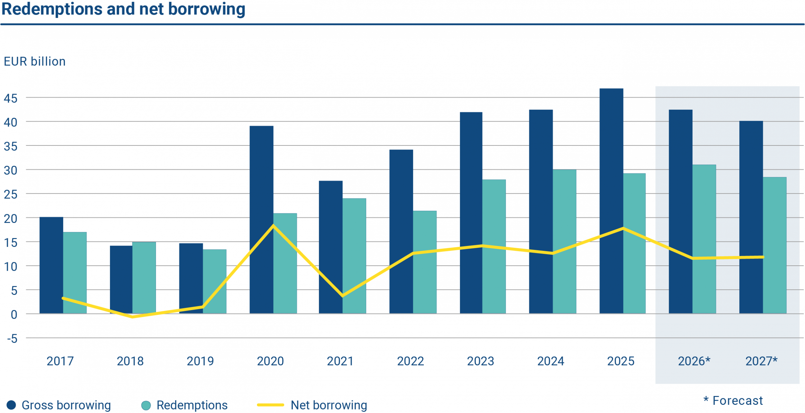 The graph shows annual gross borrowing, redemptions and net borrowing in 2017–2027. Redemptions of EUR 29.46 billion took place in 2025 while net borrowing amounted to EUR 17.80 billion.