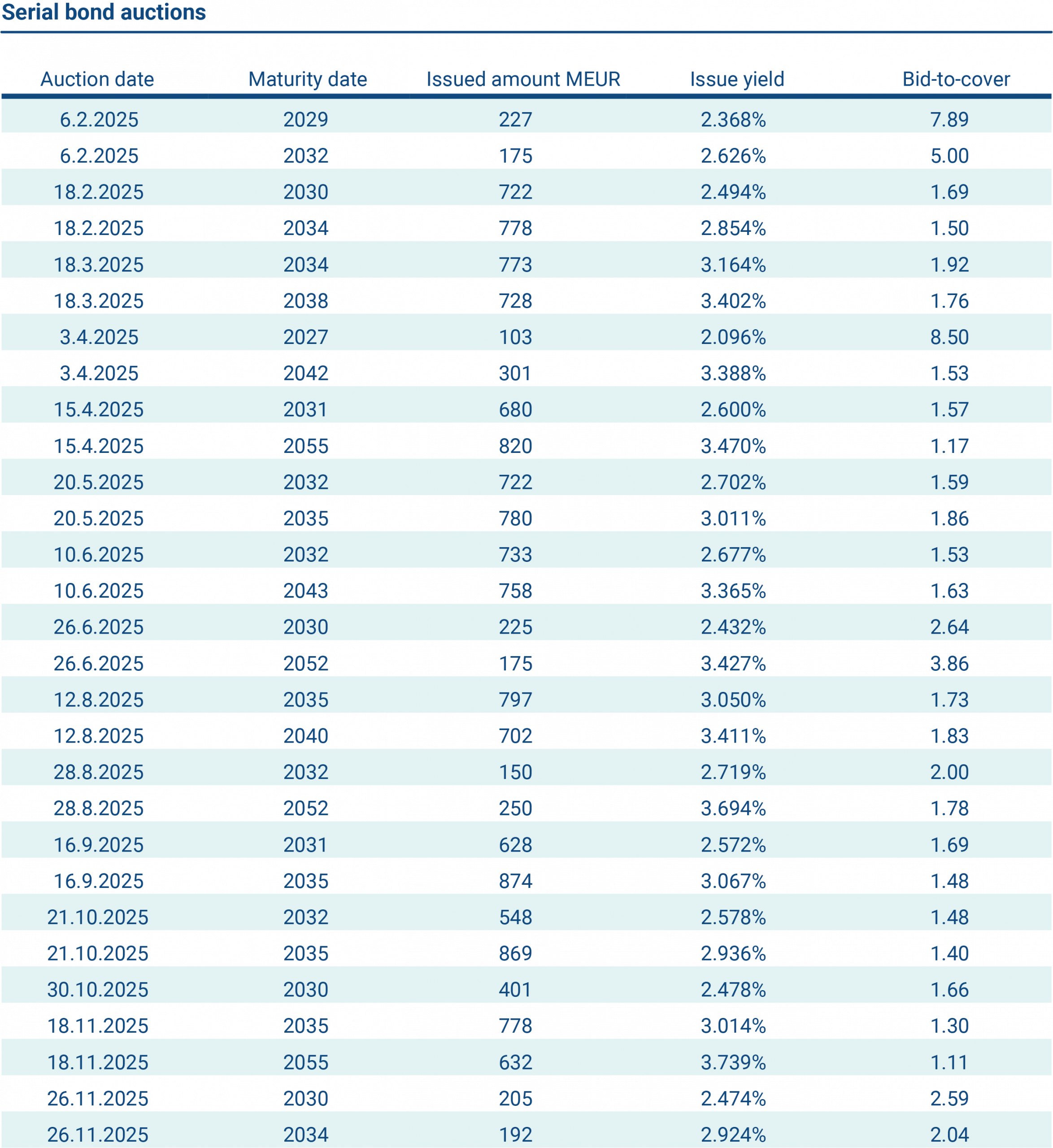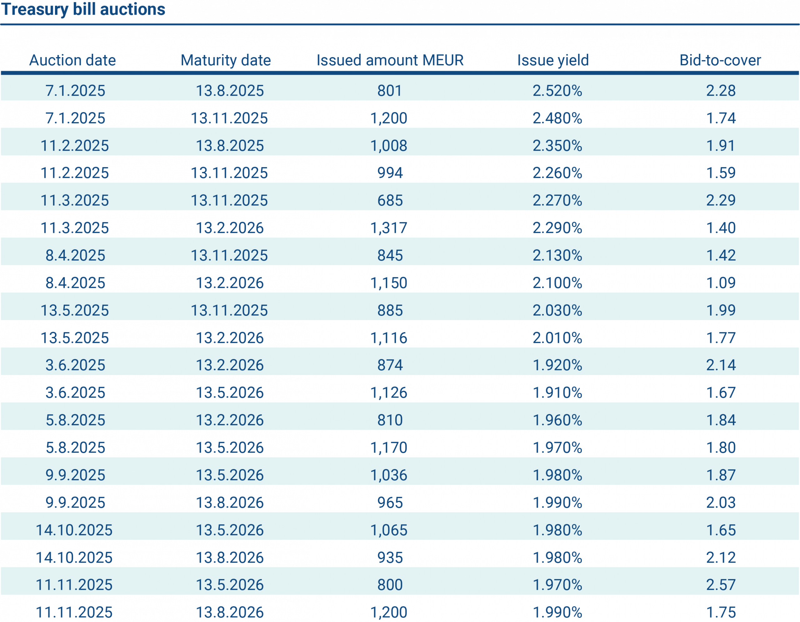 In 2025, the State Treasury organised ten Treasury bill auctions, raising a total of EUR 19,982 million.
