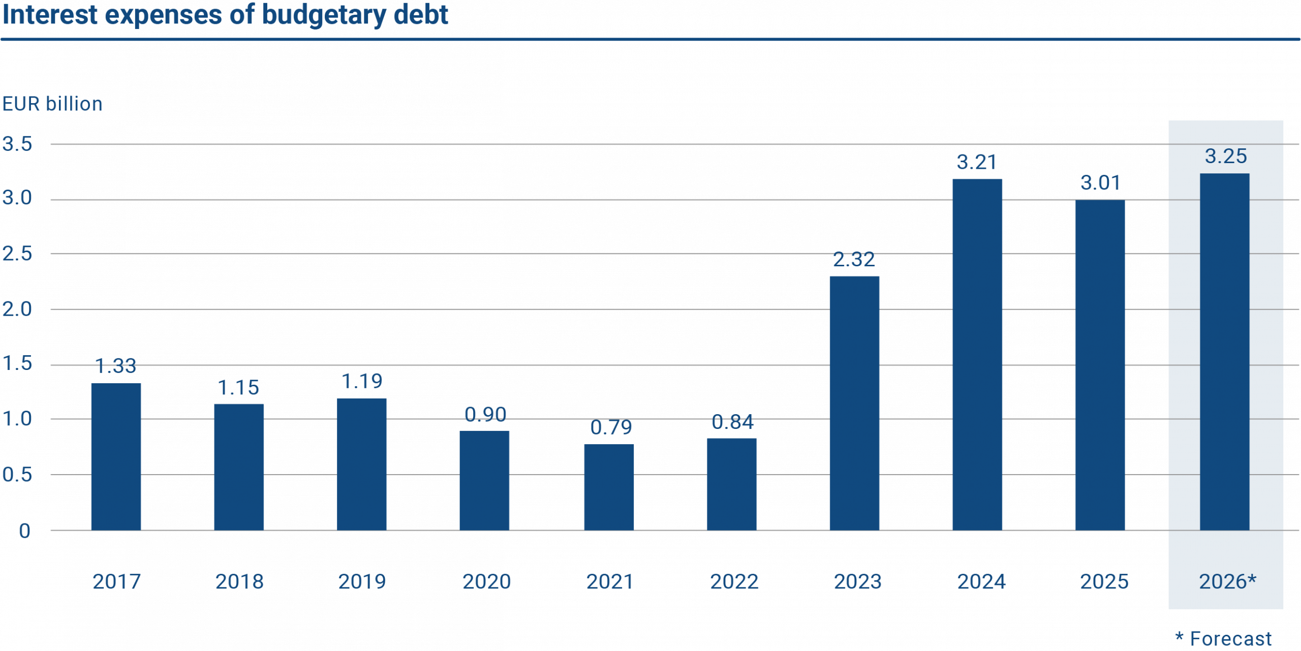 The graph shows the annual interest expenses of budgetary debt in 2017–2026. In 2025 the interest expenses were EUR 3.01 billion. The forecast for 2026 is EUR 3.25 billion.