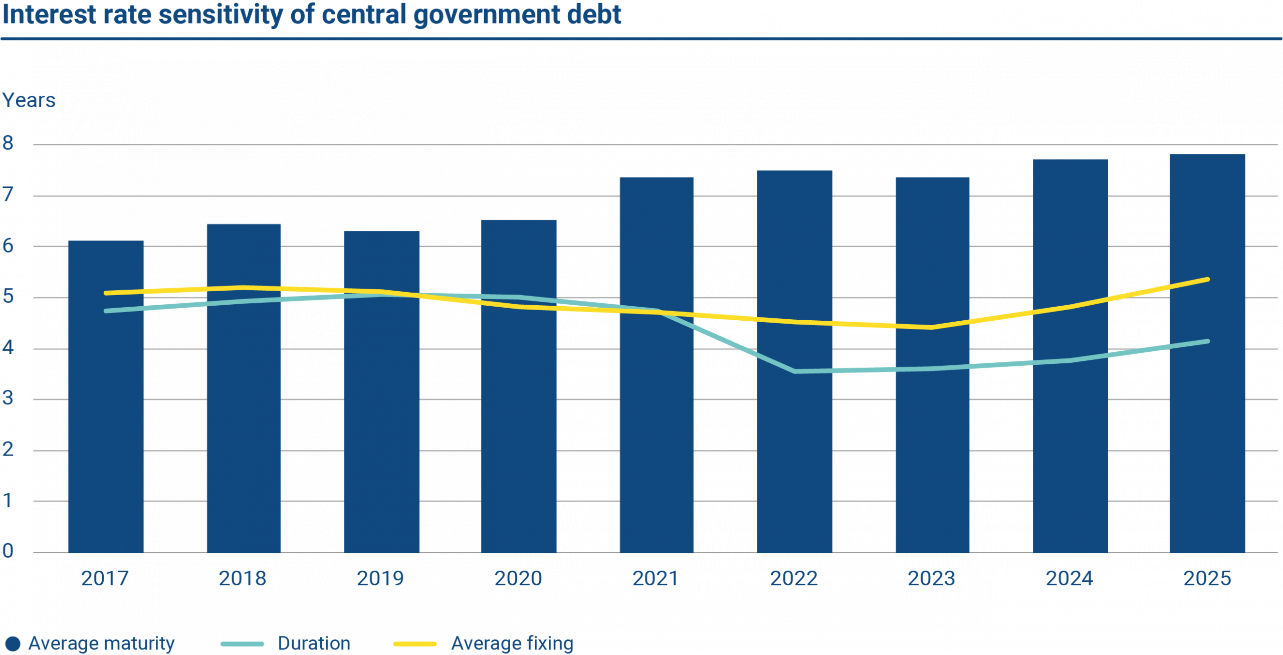 The graph shows the key figures on the interest rate sensitivity of central government debt. At the end of 2025, the average fixing of the central government debt was 5.39 years and duration 4.16 years. The average maturity was 7.84 years.