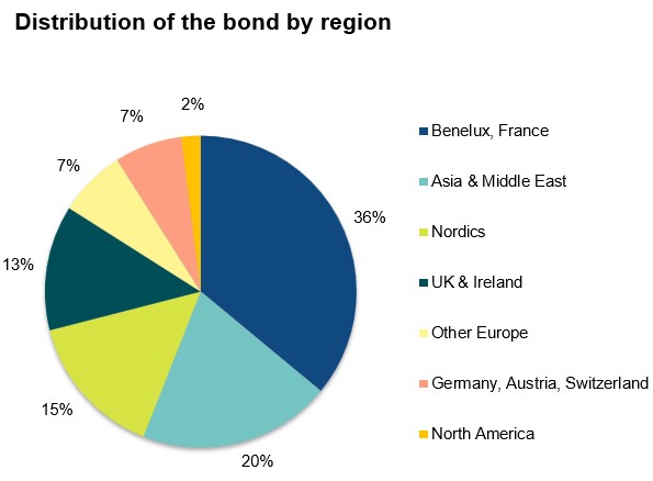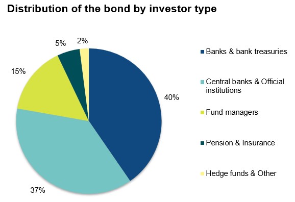 Geographically, the largest share of the bond (36%) was placed with investors in the Benelux countries and France. Asia & the Middle East received 20% of the allocation, while Nordic accounts took 15%. By investor type, banks and bank treasury desks accounted for the largest share (40%), followed by central banks and other official institutions (37%).